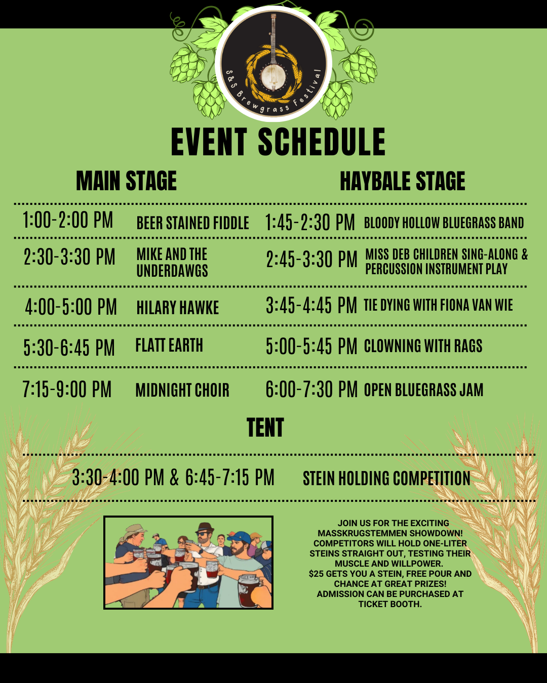 Entertainment: Stein Holding Competition, Ragliacci Clown Performer, Tye Dying with kids and more!